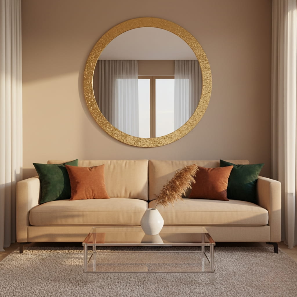- Hang a large mirror: Place a big mirror on a focal wall—above the sofa, behind a console, or opposite a window—to reflect natural light and visually expand the room.