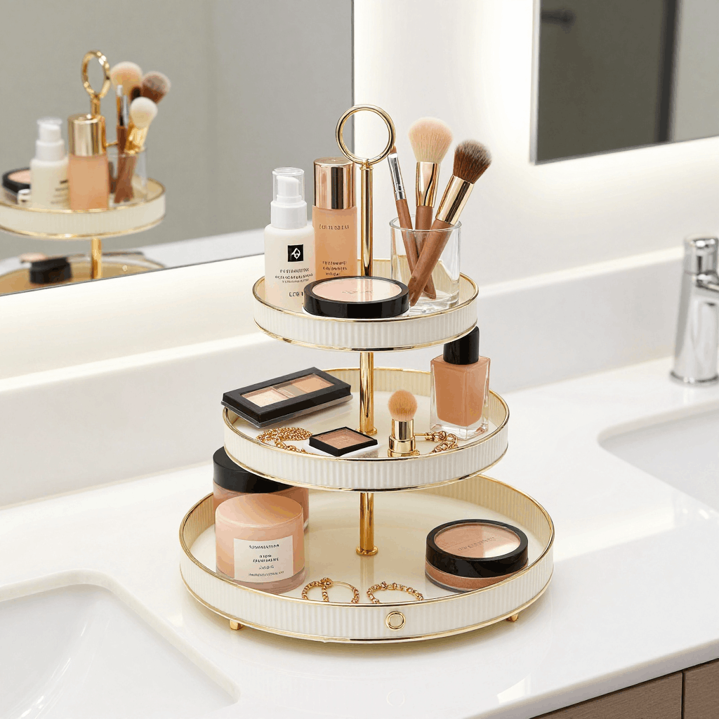 Grab a 3-tiered tray for makeup, brushes, and jewelry. Spin it for grab-and-go access that keeps counters clear and looks boutique-chic.