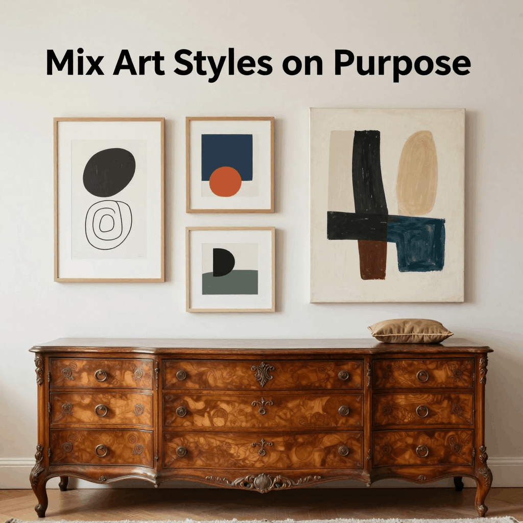 Modern art (even simple abstract prints) looks great above antique furniture and stops the space from feeling “stuck in one era.” It’s an easy way to create that old-meets-new look.